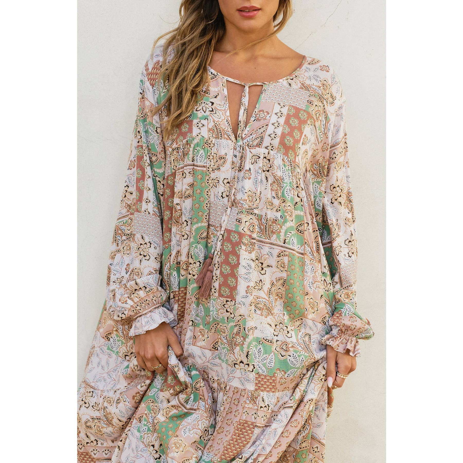 Paisley patchwork print dress with a scoop neck, tassel tie closure, and a long relaxed sleeve with elastic openings. Model is 5'8" and wearing size Small. Shell: 100% Rayon Lining: N/A
