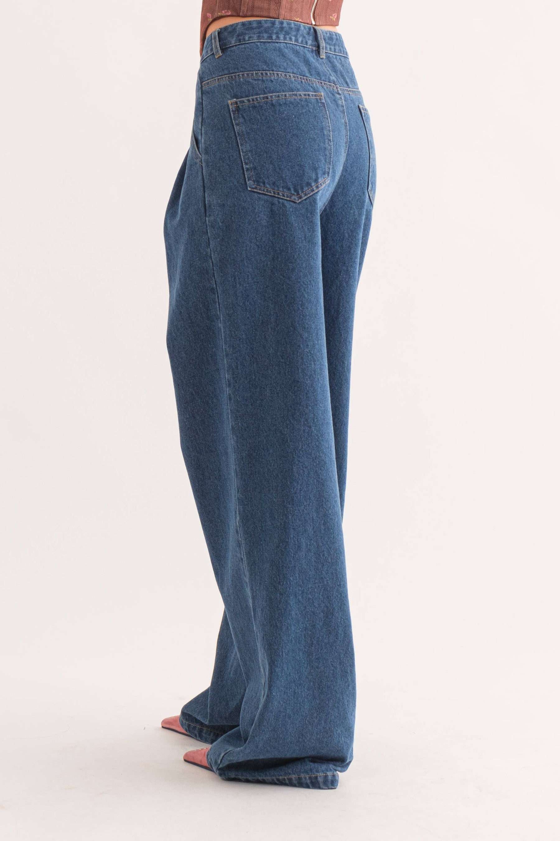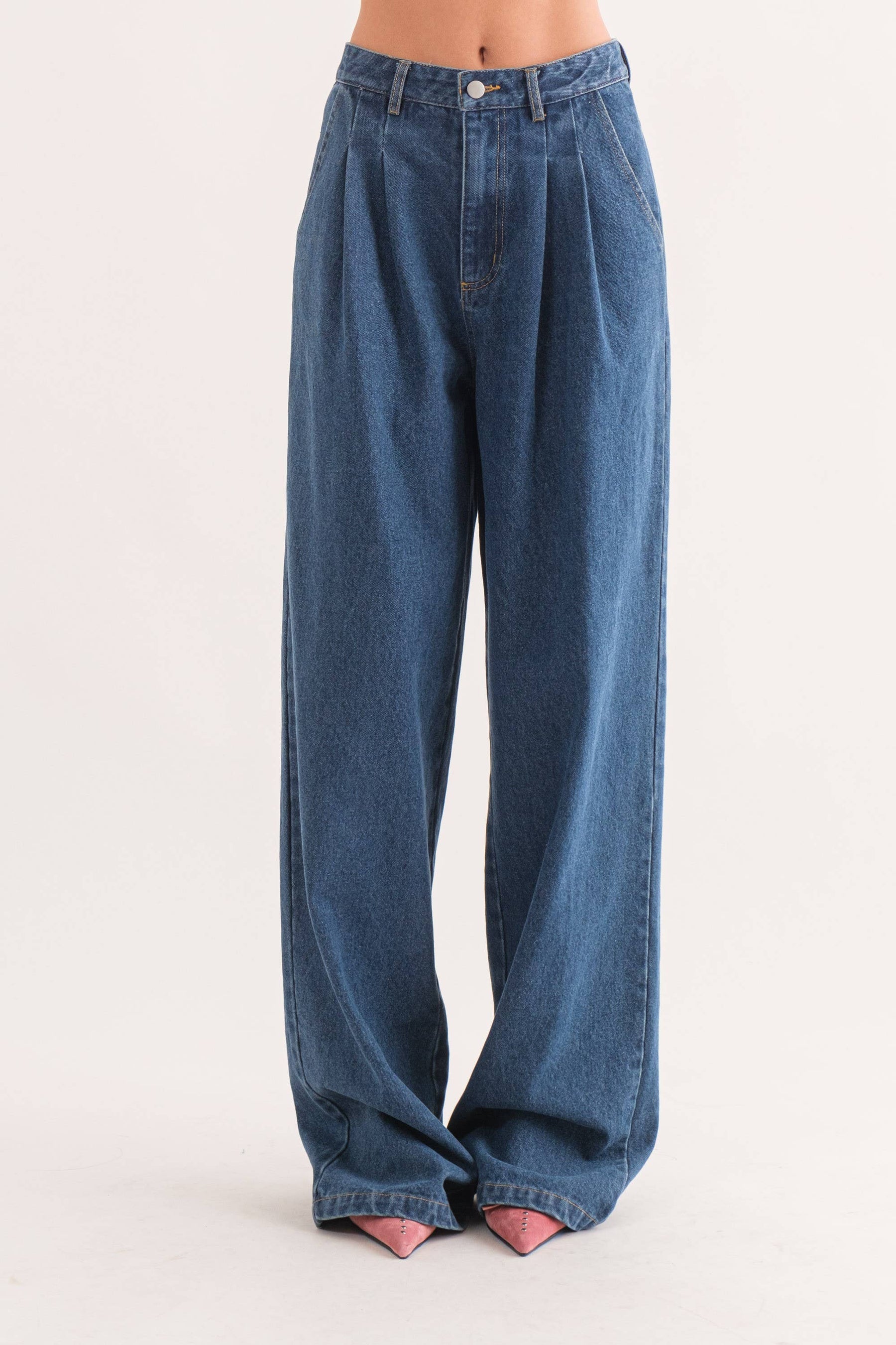Pleated, wide leg, mid-rise jeans. Longer inseam for a baggy look. Pair it with your favorite top for an off duty look.