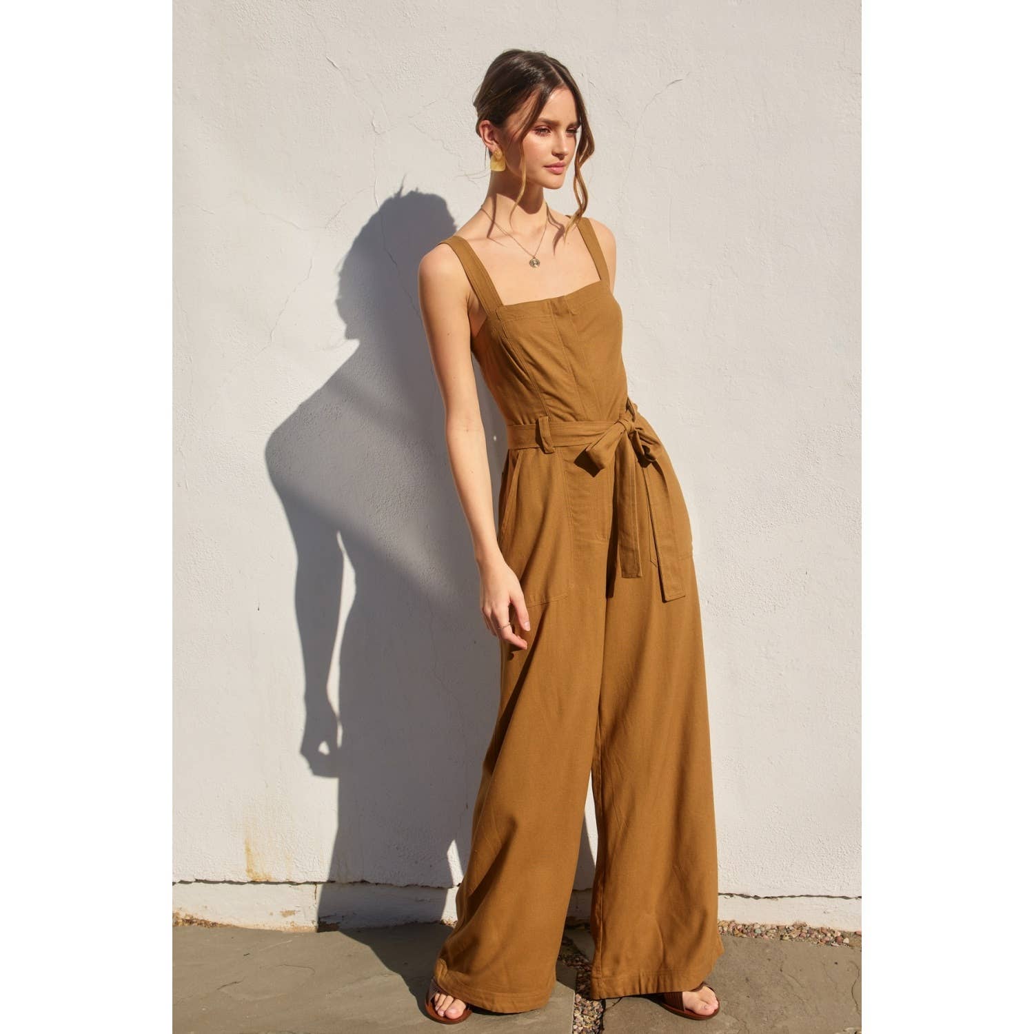 FJS12479-P1465_1 Cotton linen blend jumpsuit. Models are 5'9" and wearing size Small. - Straight neckline - Wide legs - Front button & zip closure - Self fabric belt - Side pockets - Adjustable wide shoulder straps with hidden button closures - Unlined Shell: 70% Cotton, 30% Linen Lining: