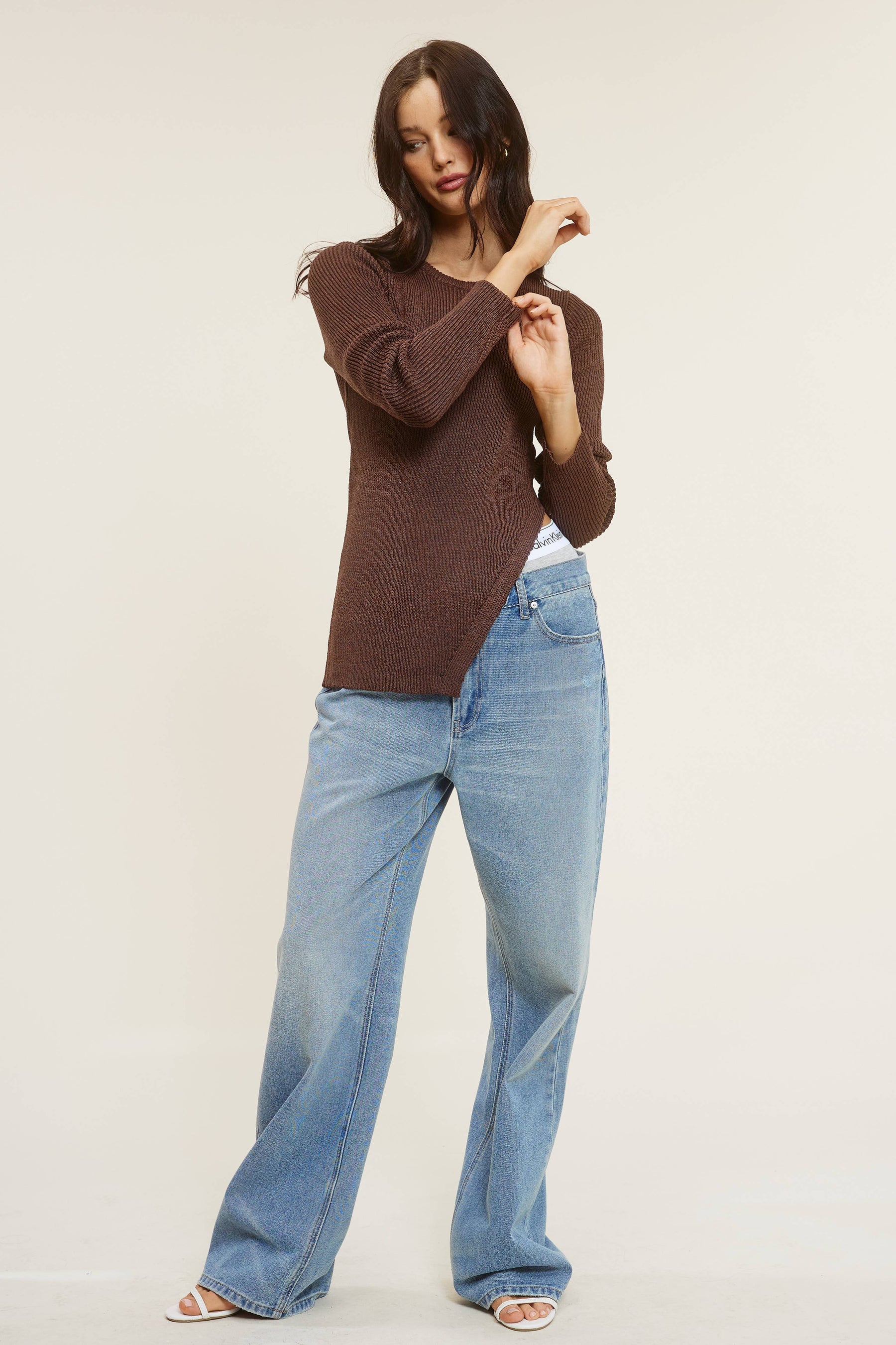 This long-sleeve solid ribbed knit sweater top retains the signature side split hem design, enhanced with a longline fit. The silhouette and fit of this top are exceptional, offering a flattering look in all the right areas, while the side slit adds a touch of allure. Pair the Tulsa sweater with most bottoms, including trousers, Cargo skirts, or denim. Embrace style and comfort with this wardrobe essential.