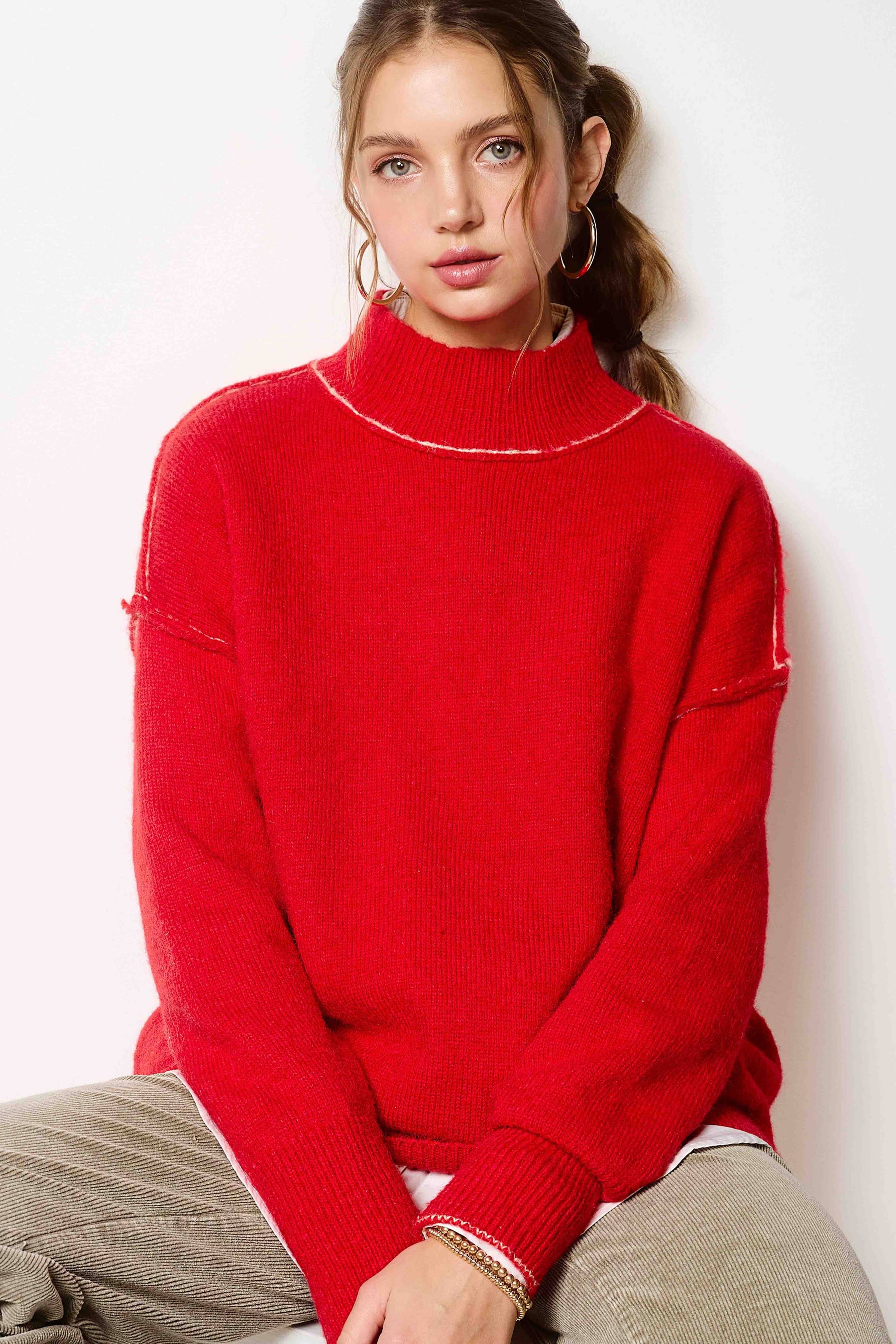 This all-time favorite sweater is featured in a staple, mock neck silhouette with dropped shoulders and a side slit. Exposed seaming for added dimension in a different color stitch adds more unique look and it's sure to be a staple in your sweater collection. Match with your favorite bottom and shoes for a variety look.