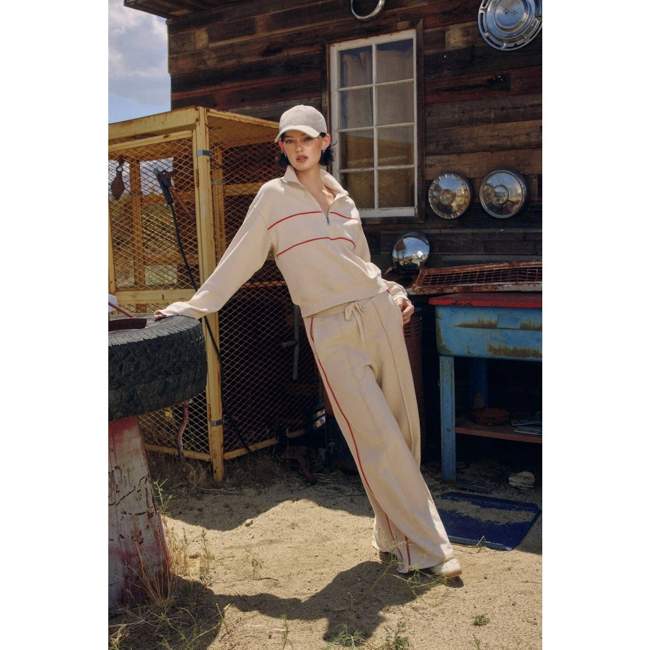 Contrast stripe wide leg sweatpants with french terry fabric. The editorial model in CREAM/RED is 5'9" and The ecomm model in NAVY is 5'9" and in CREAM/RED is 5'6". They are wearing size Small. - Drawstring fastening - Side pockets - Back faux welt pocket - Front pintuck details - Contrast stripe trim on the sides Matching top: FT13008-CP273 Shell: 51% Polyester, 49% Cotton Contrast: 51% Polyester, 49% Cotton Lining: None Available By CREAM/RED : 08/15/2025 NAVY/CREAM : 08/15/2025