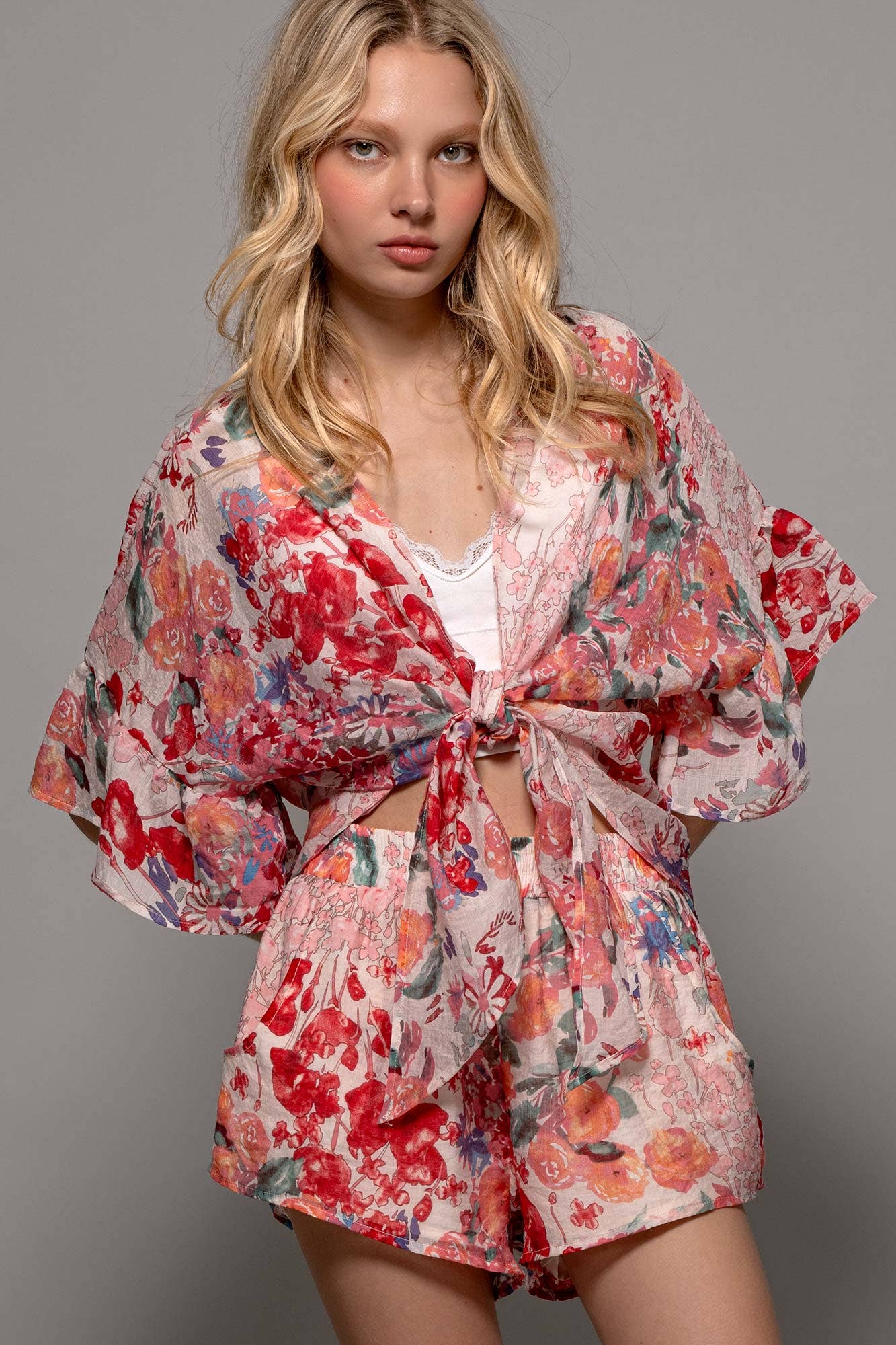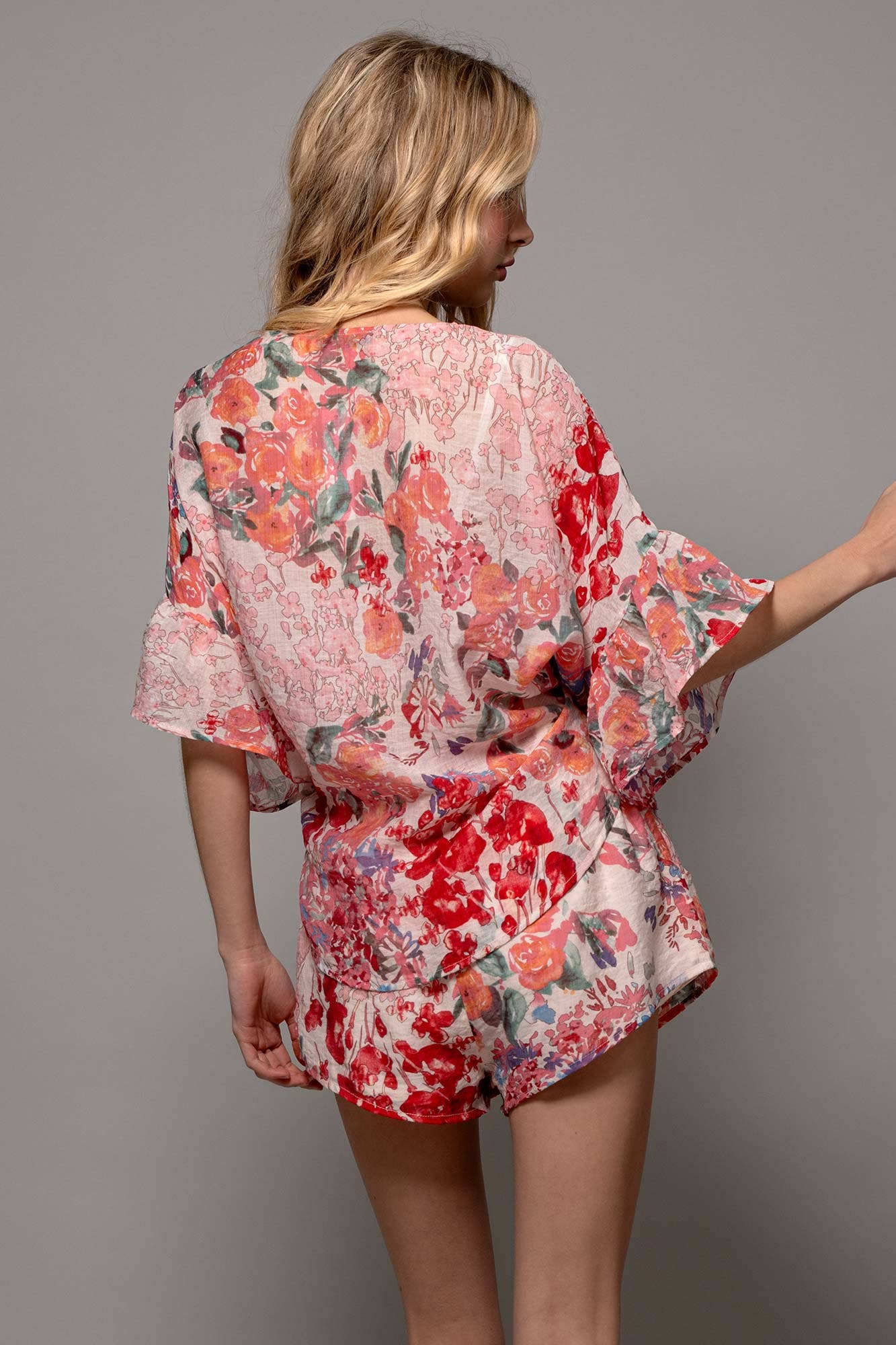 This enchanting two-piece set features a vibrant red and coral floral print on blush fabric, reminiscent of a blooming garden. The front-tie top with flutter sleeves and coordinating high-waist shorts offer versatile styling options for a romantic summer look.