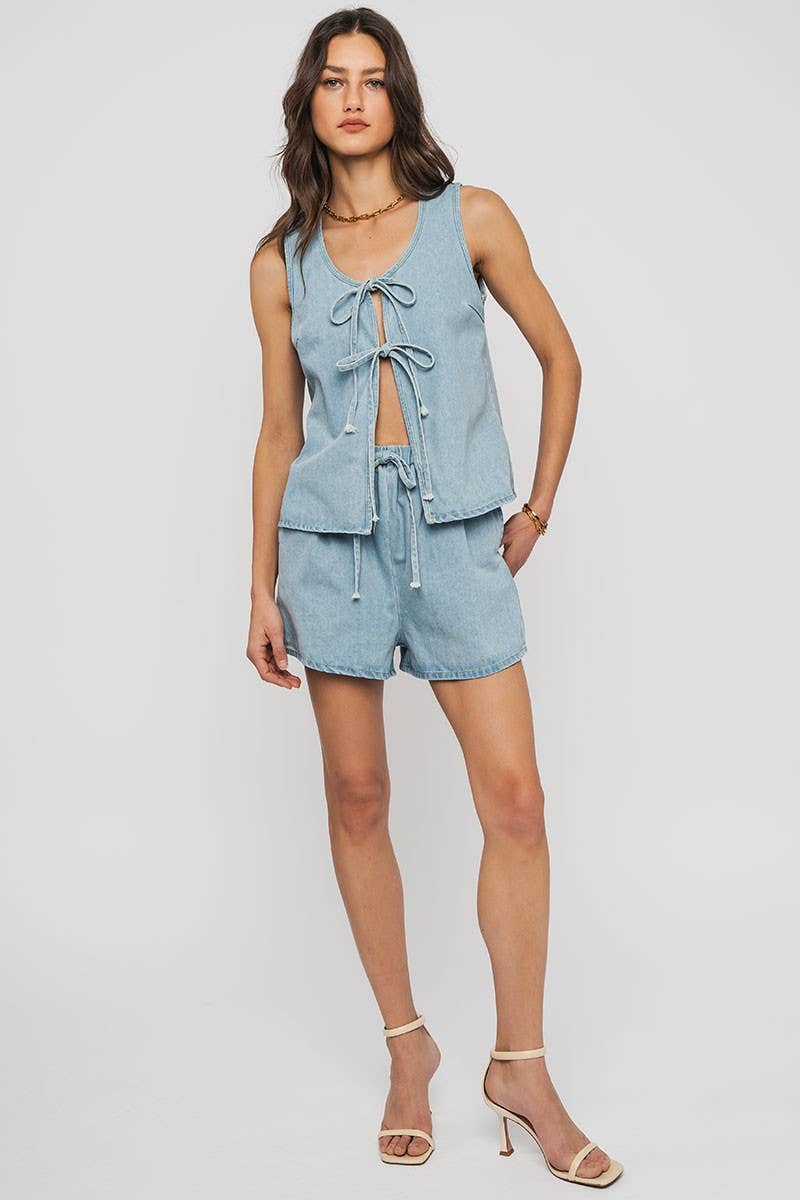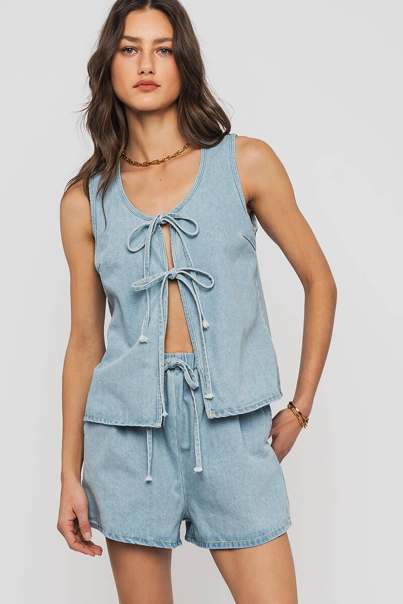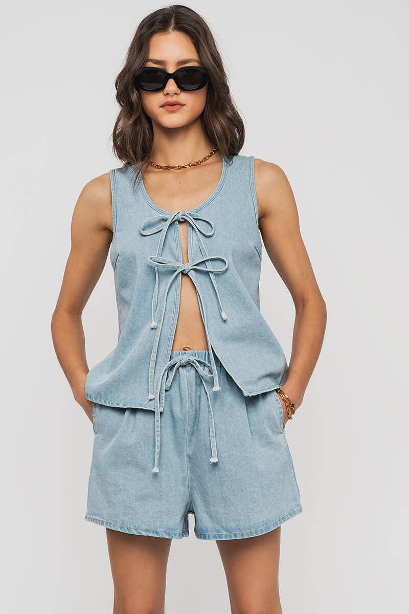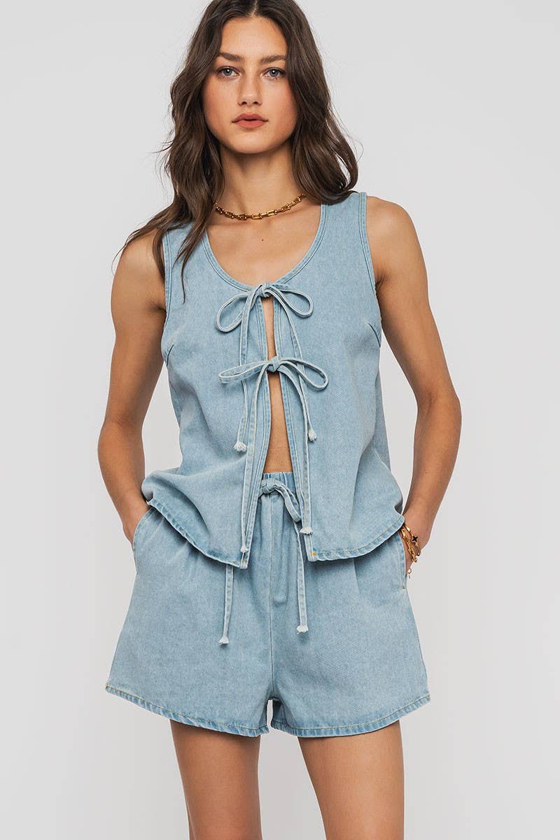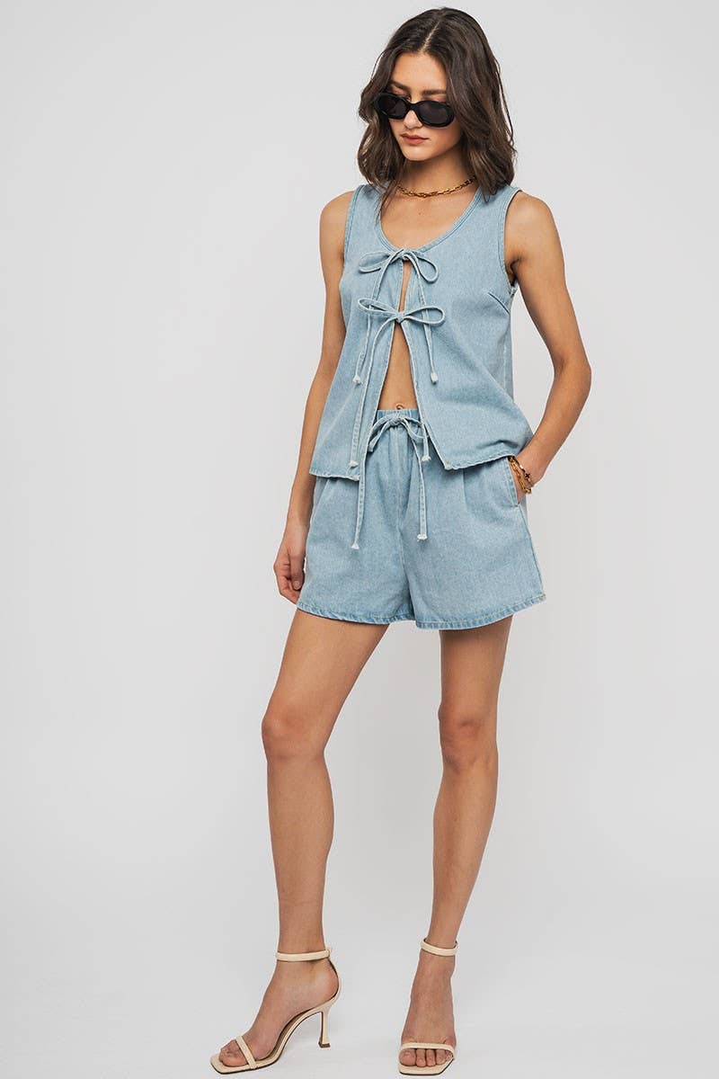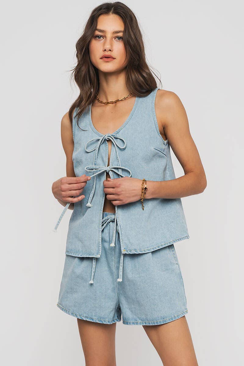 This stylish vest and shorts set features a scoop neckline, tie-closure vest, and matching shorts with an adjustable drawstring waistband. Tie-closure vest for adjustable fit • Matching shorts with drawstring waistband • Scoop neckline for a classic touch