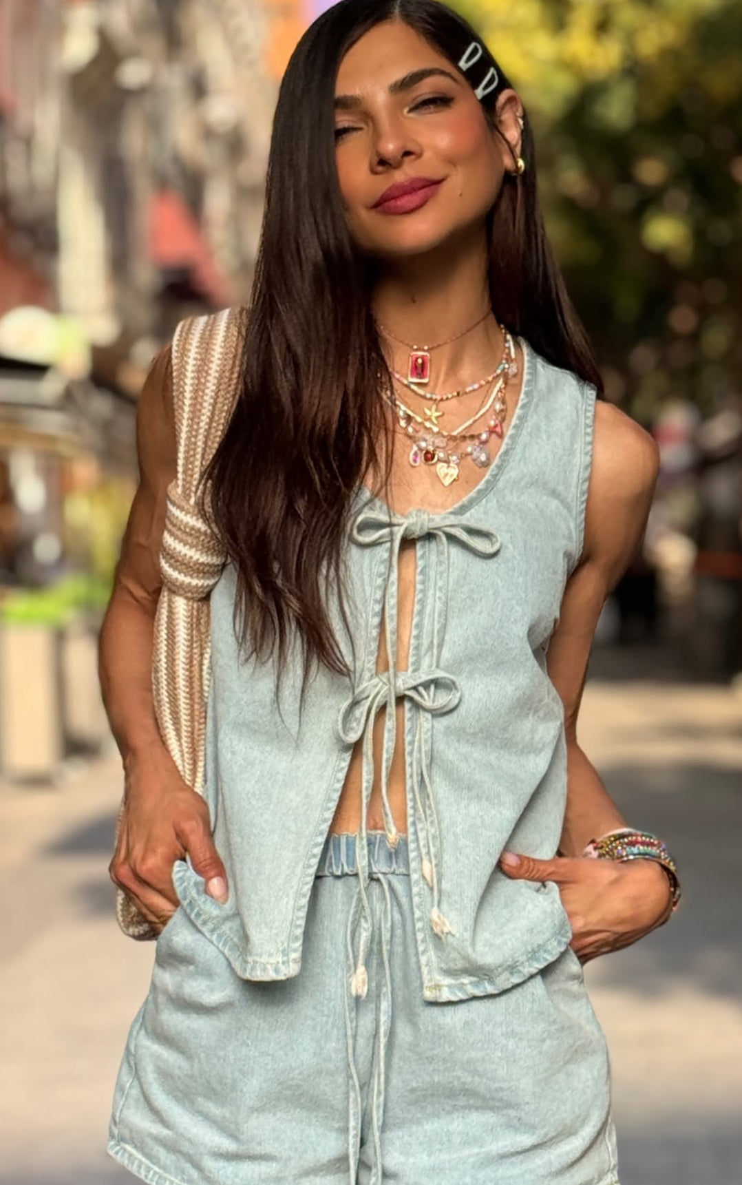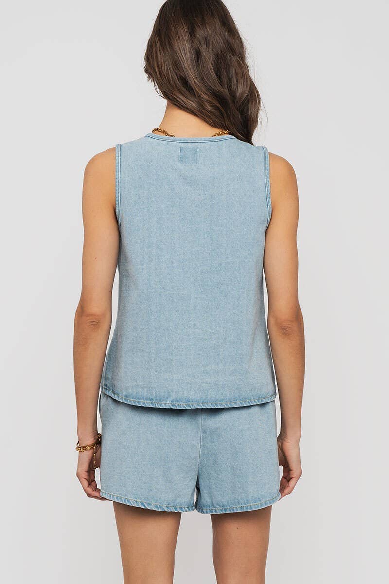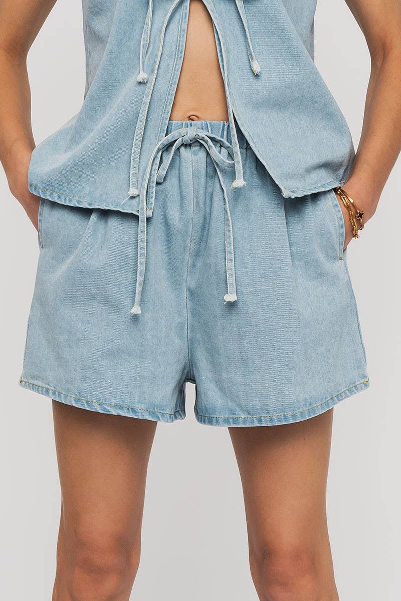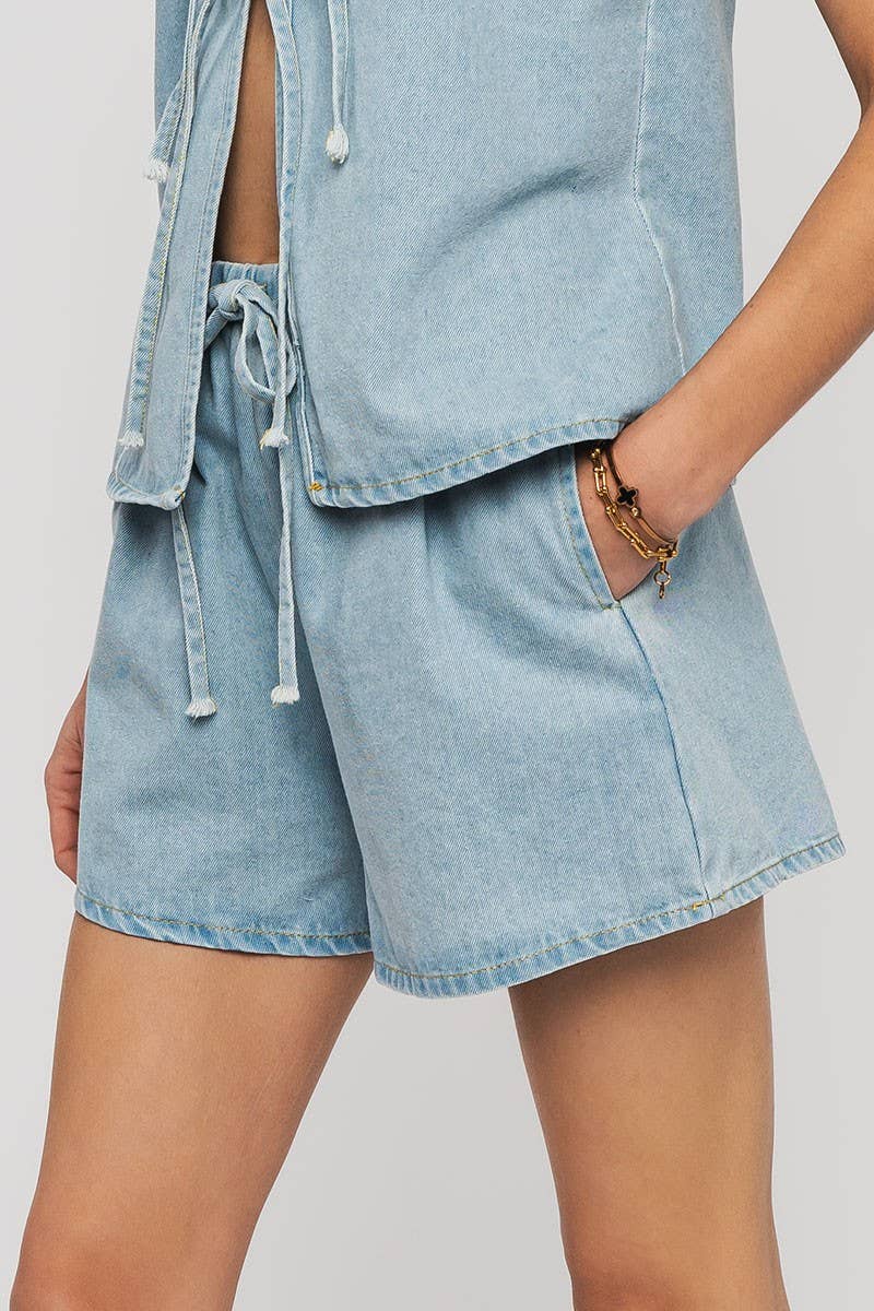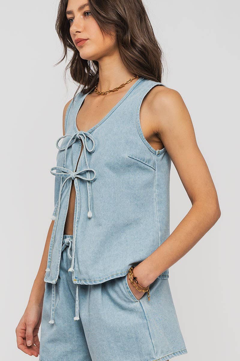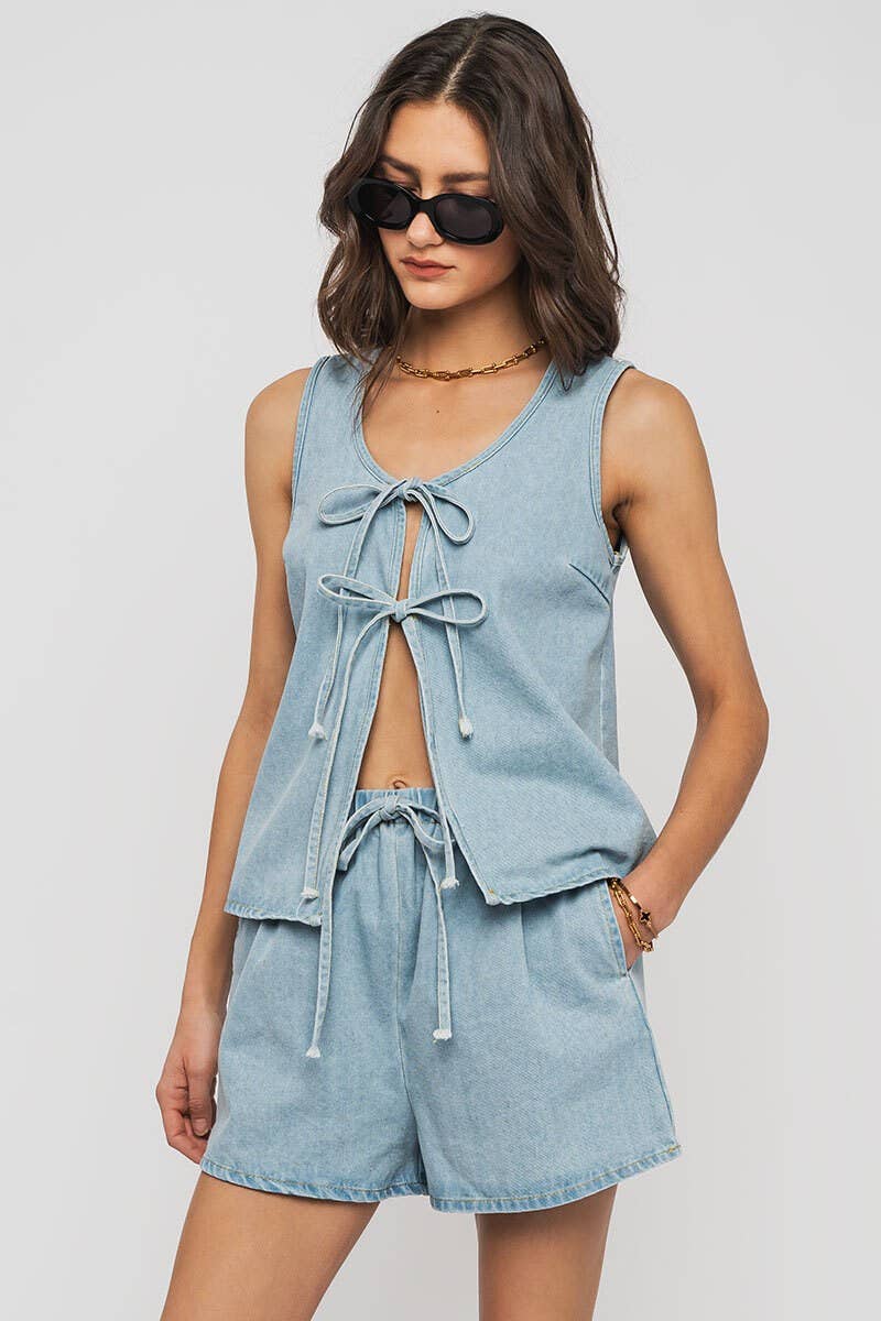 This stylish vest and shorts set features a scoop neckline, tie-closure vest, and matching shorts with an adjustable drawstring waistband. Tie-closure vest for adjustable fit • Matching shorts with drawstring waistband • Scoop neckline for a classic touch