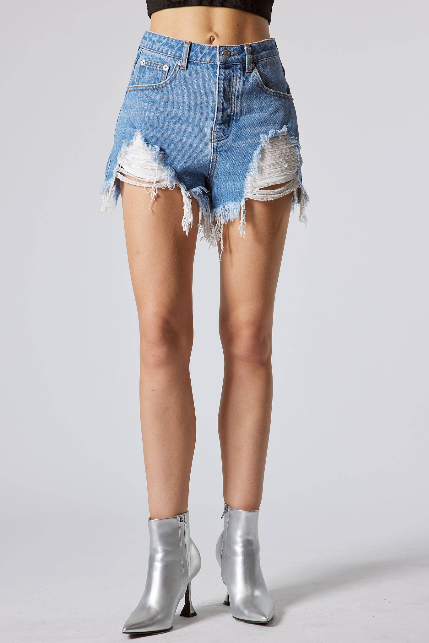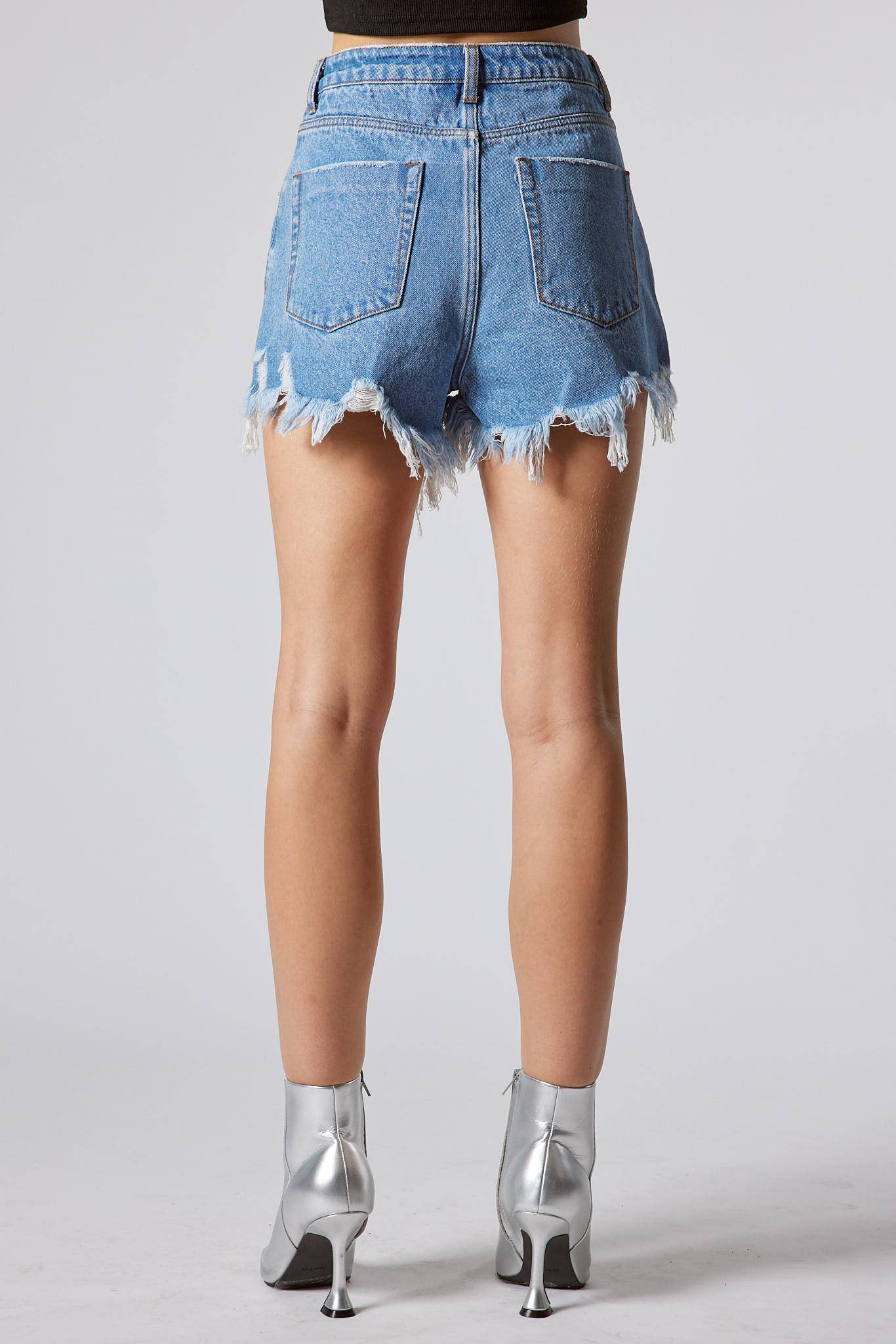 HIGH-WAISTED DISTRESSED DENIM SHORTS, FRONT AND BACK POCKETS, BELT LOOPS. FRAYED ENDS. PEEK POCKETS