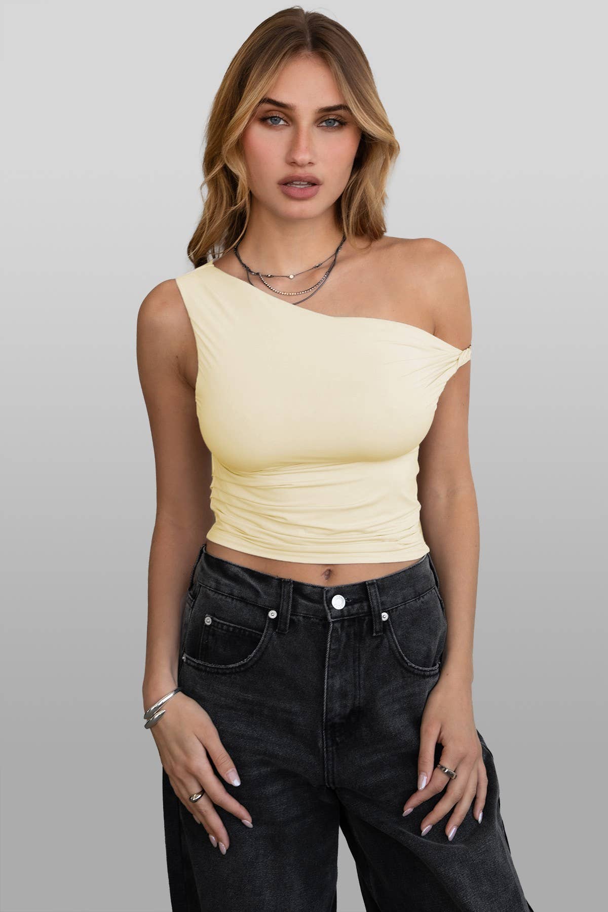 JAIME Light Weight One Shoulder Top Asymmetrical Neckline Single Off The Shoulder Twist Strap Ruching At Seams Silky Soft Stretch Slip Fabric Thin Sleek Silky Spandex Fabric