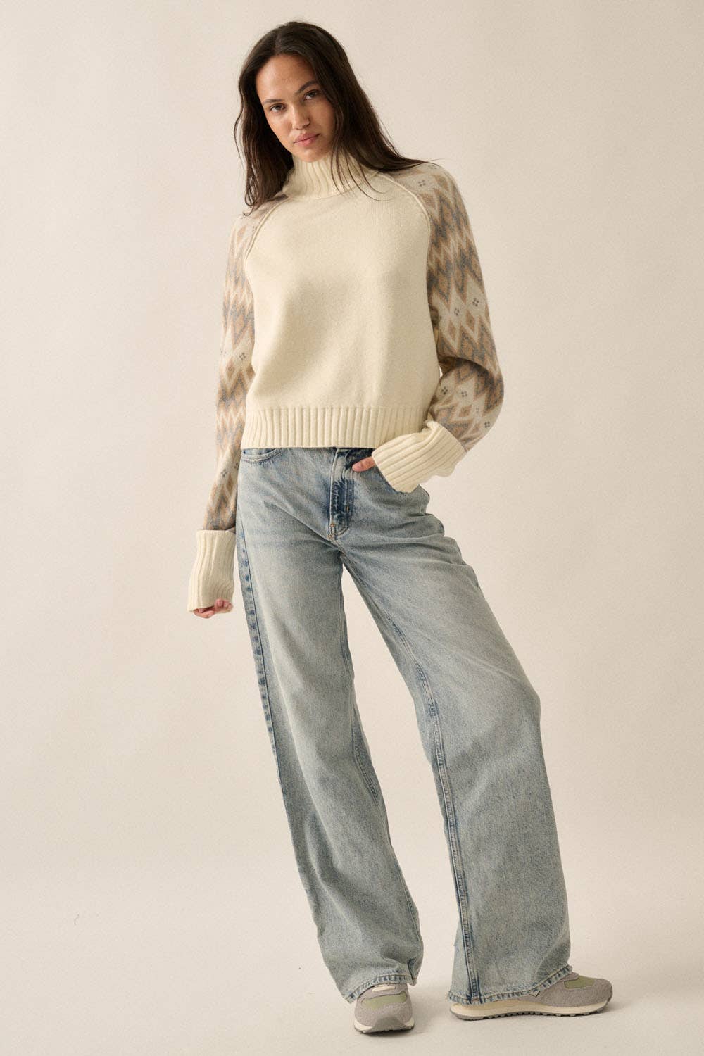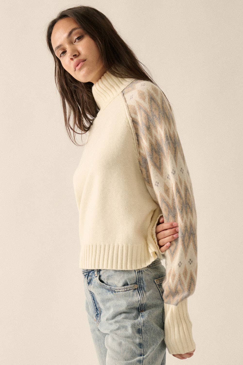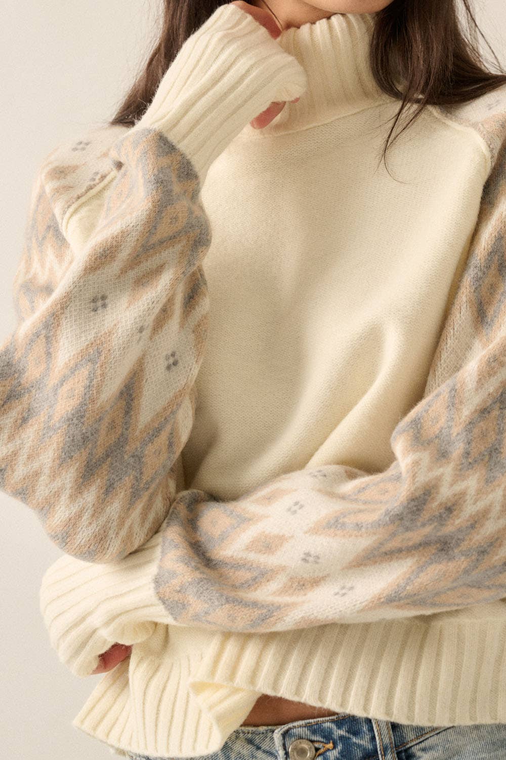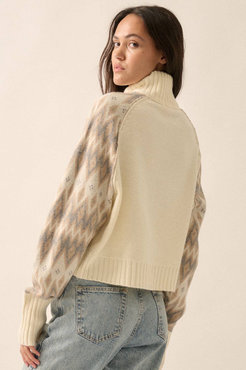 A colorblock knit sweater with the following features: High neckline with folded turtleneck collar. Solid knit body. Contrasting geometric print sleeves. Long raglan sleeves with long cuffs. Exposed seams. Ribbed knit collar, cuffs, and hem.